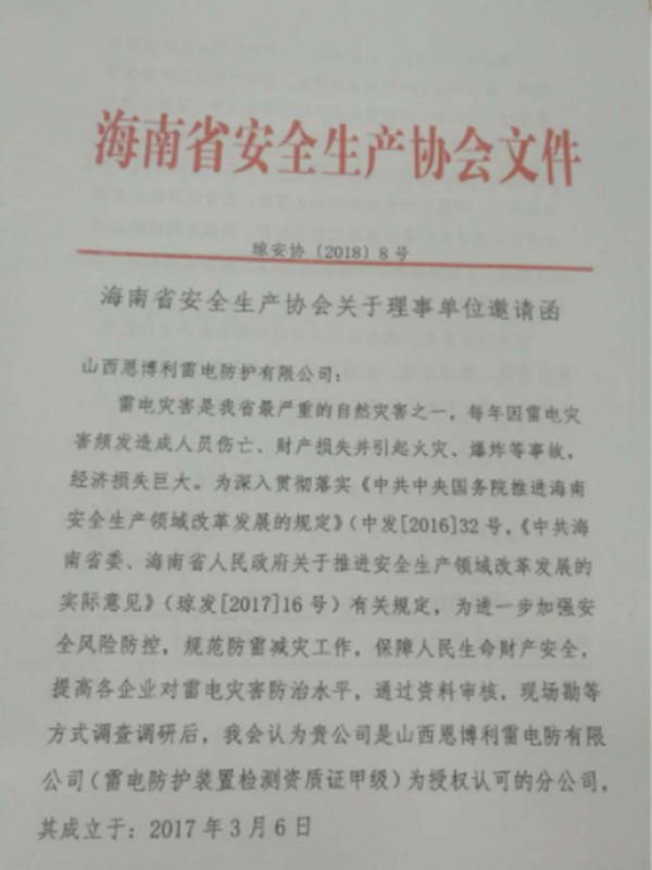山西丝瓜污视频在线下载入口雷电防护有限公司海南分公司成为 海南省安全生产协会理事单位